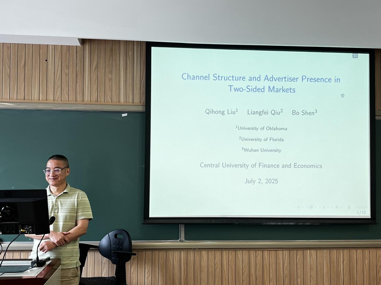 7月2日下午,刘其宏教授在学院南路校区主教楼702会议室为我校师生带来了题为“双边市场中的渠道结构与广告商存在:战略互依与市场结果”的学术讲座。刘其宏教授是平台与双边市场、产业组织领域的国际知名学者,在《经济学与统计学评论》、《管理科学》、《营销科学》等国际顶级期刊上发表论文40余篇,并担任《经济学与管理战略杂志》共同主编等多本权威期刊的编辑职务。讲座由经济学院黄乃静教授主持,现场吸引了众多师生参与。