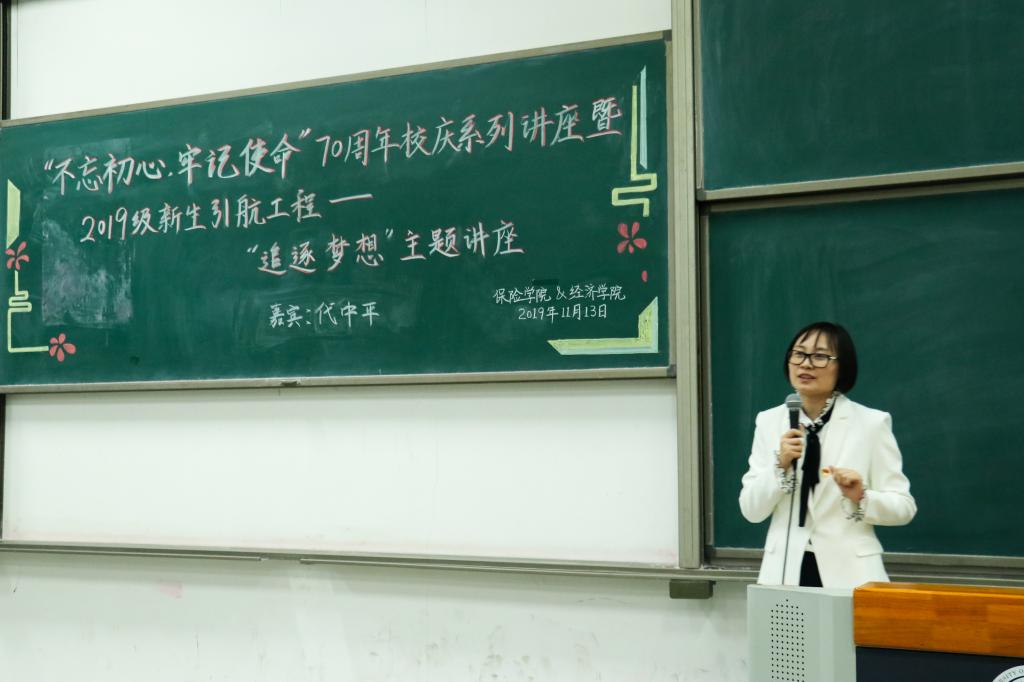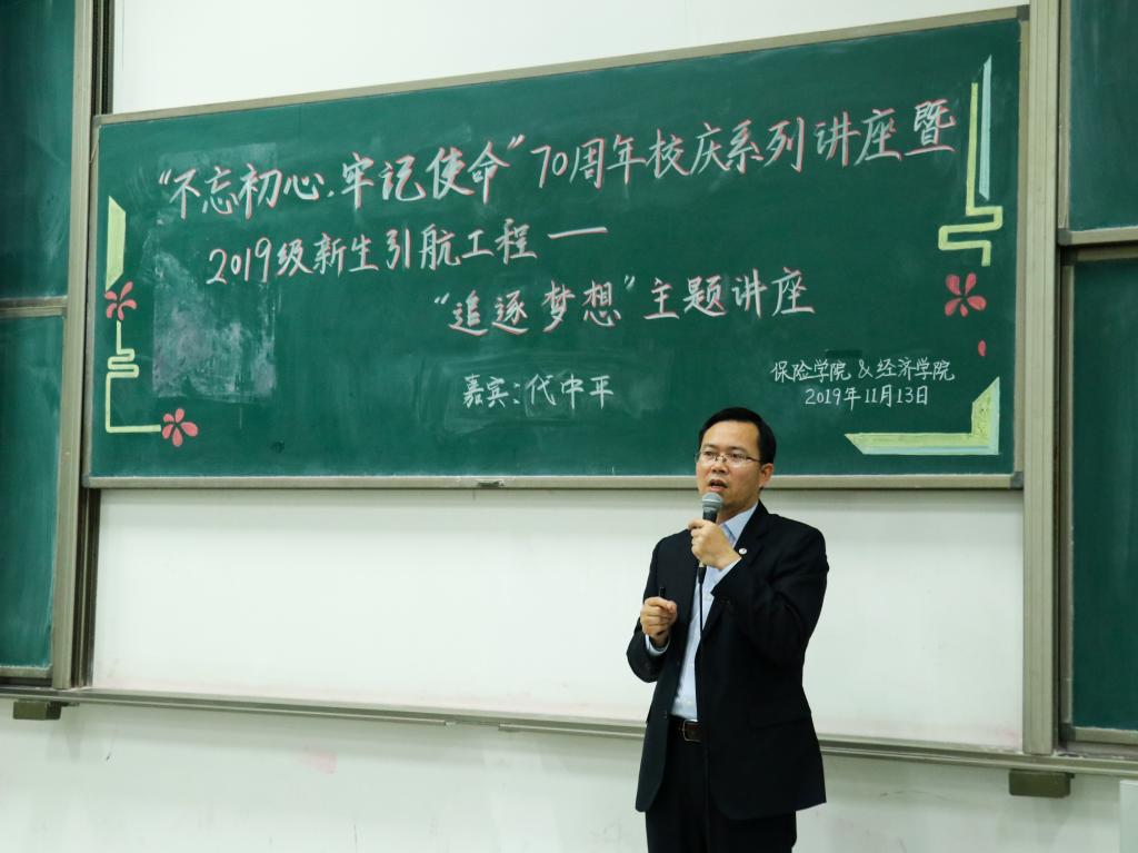 七十春秋写华章,龙马奋进起新航。为响应学校“不忘初心、牢记使命”主题教育的号召,保险学院与经济学院特别邀请到国投财务有限公司副总经理、国投保险经纪有限公司总经理、中央财经大学校外辅导员代中平为2019级新生开展“追逐梦想”主题讲座,旨在用梦想的力量指引同学们明晰目标、不忘初心,同时积极探索未来道路,不枉四年学习时光。本次讲座同时也是经济学院润园对话系列活动第二十二讲。