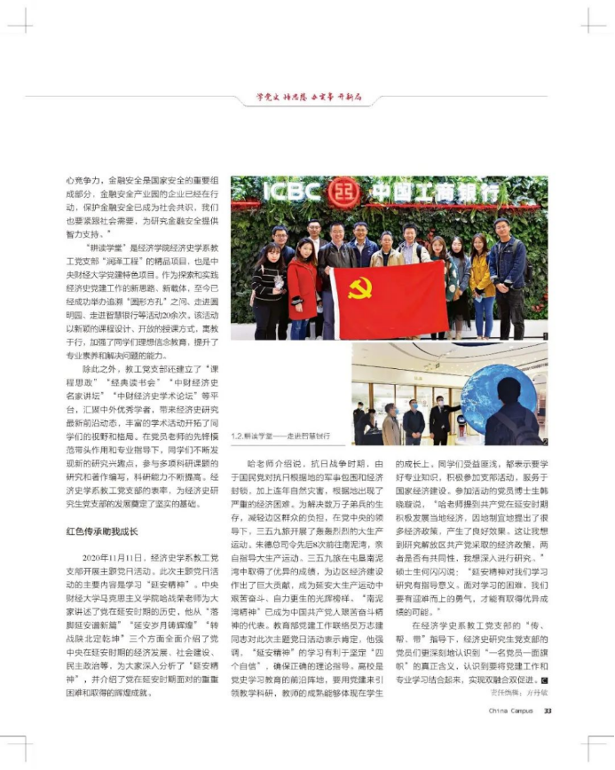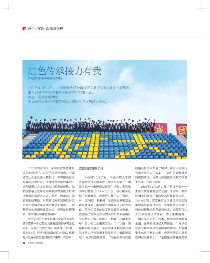 《大学生》杂志第316期以“红色传承接力有我”为题,报道了我院经济史研究生党支部。现将全文转载如下。