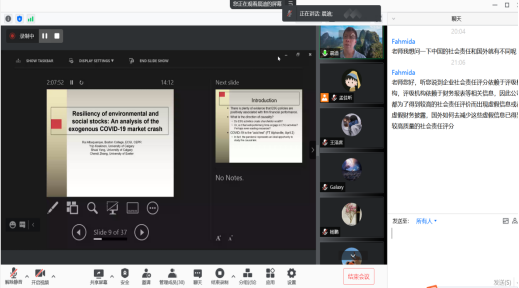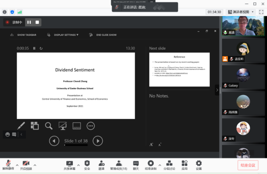 2021年9月16日和21日,英国埃克塞特(Exeter)大学可持续金融中心主任张晨迪教授应乐鱼在线登录入口邀请,使用腾讯会议APP讲授行为金融专题研究短期课程。20多位师生参加了此次课程。