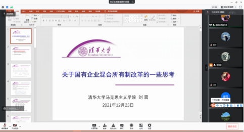 2021年12月23日下午15:00,清华大学马克思主义学院长聘副教授、博士生导师刘震应经济学院樊茂清教授邀请,开展主题为“关于国有企业混合所有制改革的一些思考”的讲座,本次讲座通过腾讯会议平台线上举行,刘震老师受到了老师和同学们的热烈欢迎!经济学院樊茂清教授主持了本次线上学术交流会。