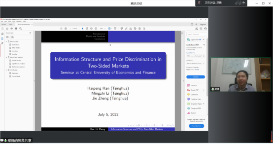 2022年7月5日清华大学经济管理学院副教授郑捷应经济学院邀请,开展主题为“Information Acquisition and Price Discrimination in Two-sided Duopoly Markets”的讲座,本次讲座于下午2点在线上的腾讯会议举行,持续近两个小时。经济学院尹振东教授主持了此次线上讲座,史宇鹏教授、洪圣杰副教授、龚雅娴副教授和吴楠老师与学生们共同参与了本次讲座。