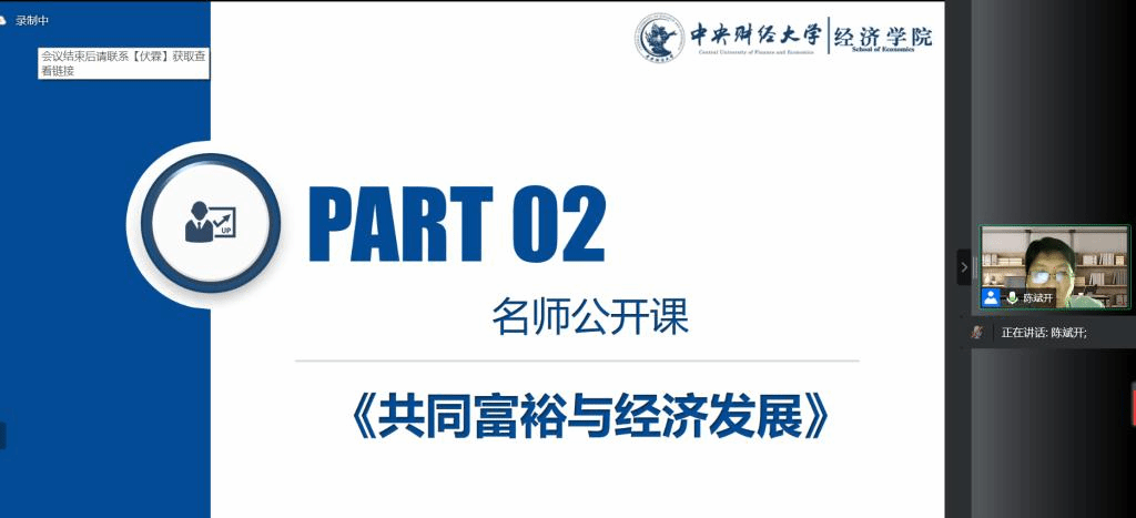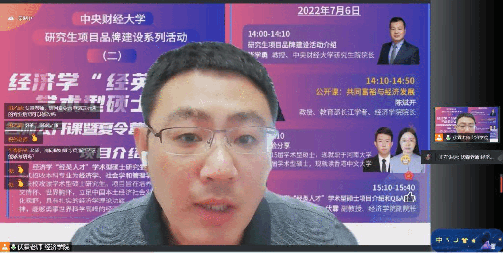 近年来,经济学院以学科建设为引领,不断凝练和培育具备中央财经大学典型特色和核心竞争力的优质研究生项目品牌——经济学“经英人才”学术型硕士项目。为切实推进学校研究生教育内涵式发展和品牌化建设,不断提高研究生生源质量,在研究生院的指导下,7月6日下午,“名师公开课暨夏令营招生宣讲会”通过腾讯会议在线举行。研究生院院长张学勇介绍了学校研究生项目品牌建设系列活动,经济学院院长、教育部长江学者特聘教授陈斌开在线讲授了“共同富裕与经济发展”的公开课,朱俊兵和许伟两位校友分享了曾经在经济学院学习的感受,研究生院副院长陈运森教授、经济学院刘滨老师、祝伟老师、研究生招生办公室任阳老师及校内外同学参加了本次活动,宣讲会由经济学院副院长伏霖主持。