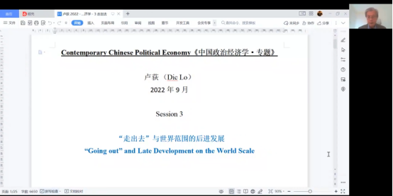 经济学院于2022年9月17-18日、9月24-25日举办了海外学者经济学前沿课程——《中国政治经济学·专题》系列讲座,主讲人为英国伦敦大学亚非学院(SOAS,University of London)卢荻教授,本次讲座的主持人为经济学院副院长赵文哲教授。他对卢荻教授表达了热烈的欢迎,并简要介绍了本次海外学者经济学前沿课程——《中国政治经济学·专题》系列讲座的主题内容和日程安排。