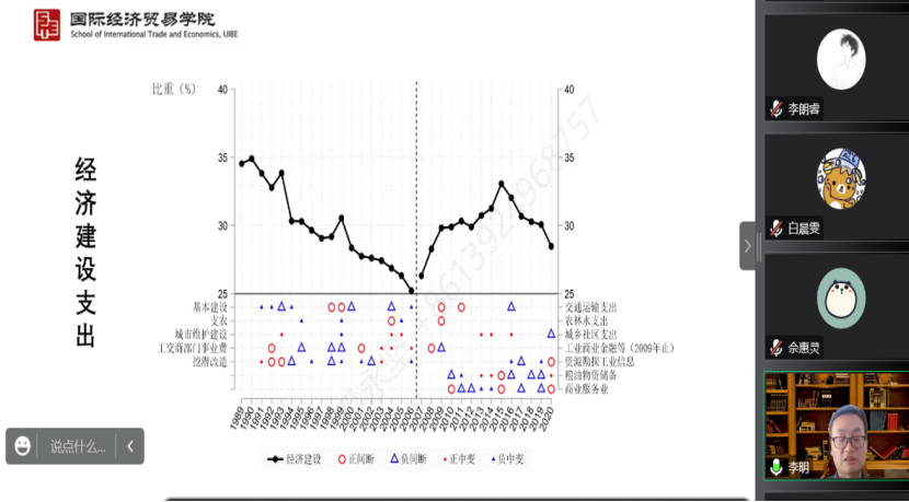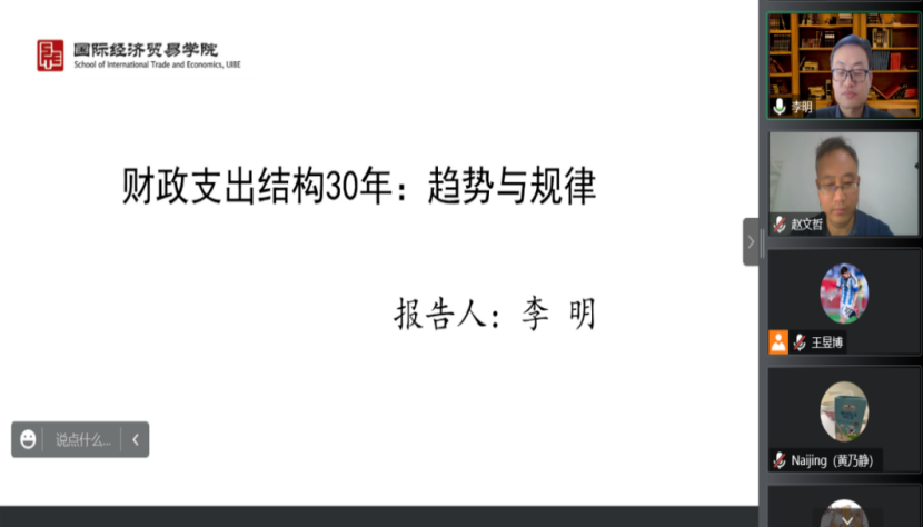 2022年11月15日14:00,对外经济贸易大学财政税务学系教授、博士生导师,政府管理学院副院长李明应经济学院邀请,开展主题为“财政支出结构30年:趋势与规律”的讲座。本次讲座在线上举行,李明教授受到了老师和同学们的热烈欢迎!经济学院赵文哲教授主持讲座,尹振东教授、黄乃静副教授、杨晓兰副教授参加了讲座。