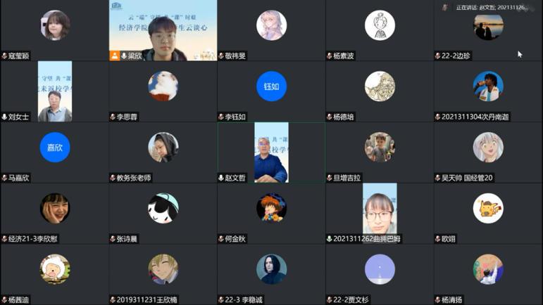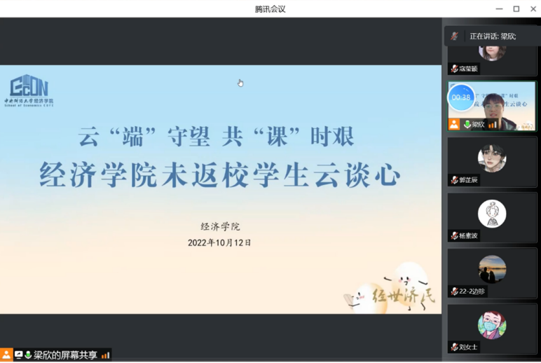 共克时艰携手前行,云端助力经心相守。为深入了解未返校同学们的思想、学习、生活状态,积极引导同学们树立积极乐观的心态,解决学生实际困难,经济于2022年10月12日15:00线上举办了云“端”守望,共“课时艰”——经济学院未返校学生“云谈心”活动。学院副院长赵文哲,学院党委副书记耿卉,组织员刘滨,本科教务干事张珏,22级本科生辅导员任晶,学院团委兼职副书记、21级本科生班主任何金秋,学院团委副书记、20级本科生辅导员梁欣,未返校本科生和校内对接志愿者一起在线上充分沟通交流。
