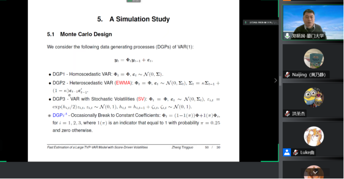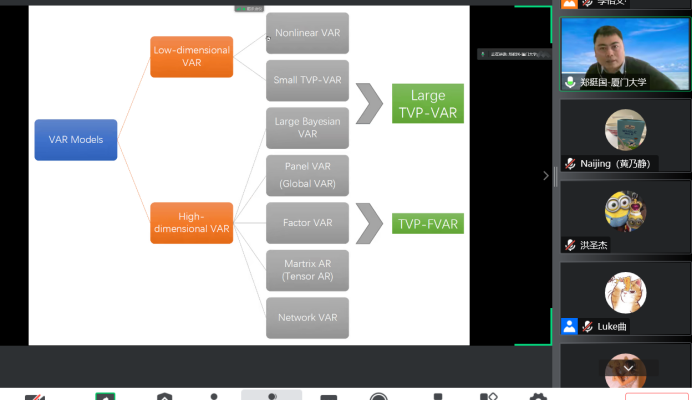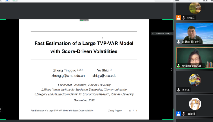 2022年12月8日14:00,厦门大学经济学院和王亚南经济研究院教授、厦门大学特聘教授、博士生导师郑挺国教授应乐鱼在线登录入口邀请,进行了主题为“Fast Estimation of a Large TVP-VAR Model with Score-Driven Volatilities”的讲座。本次讲座在线上进行。郑挺国教授受到了经济学院老师与同学们的热烈欢迎。经济学院黄乃静副教授主持讲座,洪圣杰副教授参加了讲座。