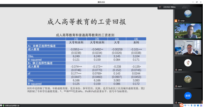 其次,邢春冰教授对研究问题进行了阐明。一是成人高等教育的规模和分布情况如何?二是哪些人选择了成人高等教育?三是成人高等教育的回报率有多高?四是成人高等教育如何影响人力资本水平的测量?五是成人高等教育如何影响教育回报率的估计?