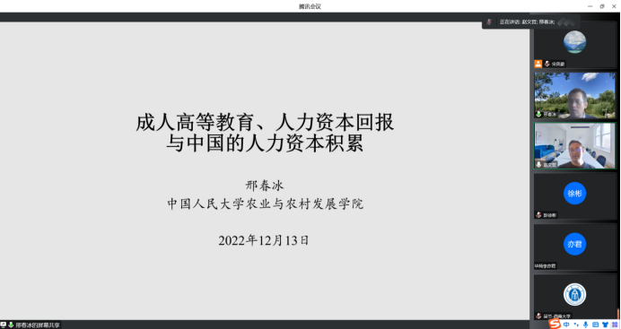 2022年12月13日14:00,中国人民大学农业与农村发展学院教授邢春冰应乐鱼在线登录入口邀请,进行了主题为“成人高等教育、人力资本回报与中国的人力资本积累”的讲座。本次讲座在线上进行,邢春冰教授受到了经济学院老师与同学们的热烈欢迎。经济学院赵文哲教授主持讲座,陈斌开教授参加了讲座。
