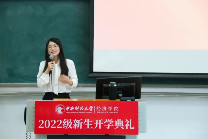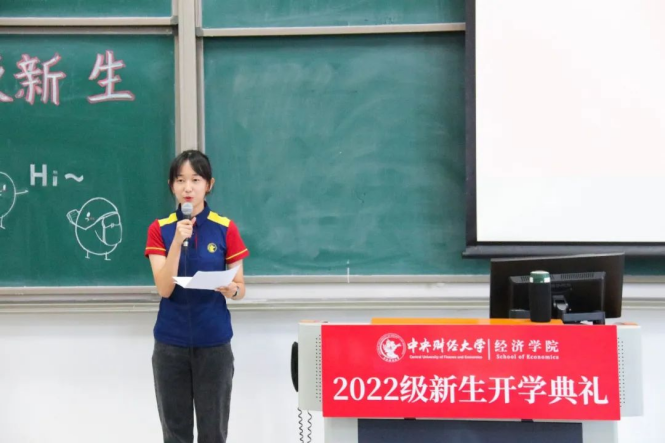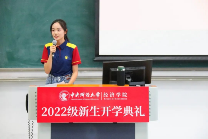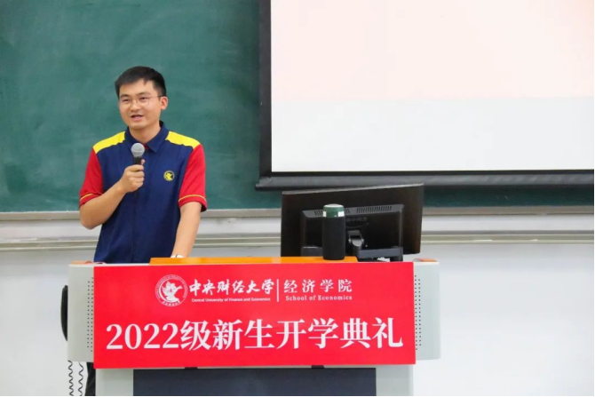 2020级硕士研究生王立作为在校生代表分享了自己在中财大经济学院的成长历程和丰富体验。号召同学们能在巩固学业的同时拥抱多彩的校园生活,牢记“经世济民”的理想与目标,将家国情怀融进血液、化作行动,把为人民谋幸福、为民族谋复兴作为毕生的追求。