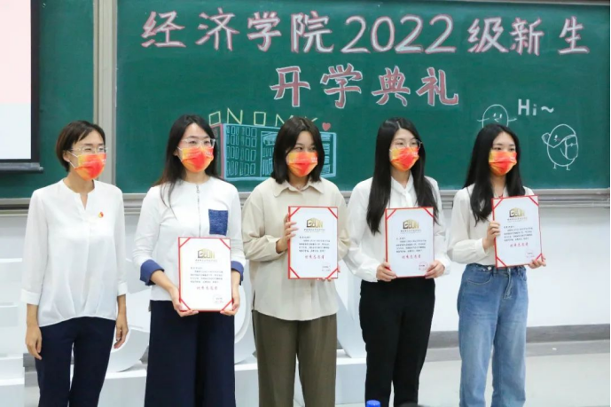 典礼现场举行了2022级本科新生“宿舍指导员”聘任仪式。2021年10月,学院党委在全校范围内率先成立了经济学院宿舍指导员功能型党支部,推动党建工作进宿舍,以党建引领学生宿舍建设。新学年,学院党委在研究生和本科高年级学生中遴选了34位思想政治过硬、综合素质优秀的同学,担任科生“宿舍指导员”,发挥学生党员的先锋模范作用和朋辈间的互助引领作用。宿舍指导员功能型党支部党建指导员梁延东为6名宿舍指导员工作组组长代表颁发聘书,党支部将发挥学生党员的先锋模范和引领作用,助力新生成长。