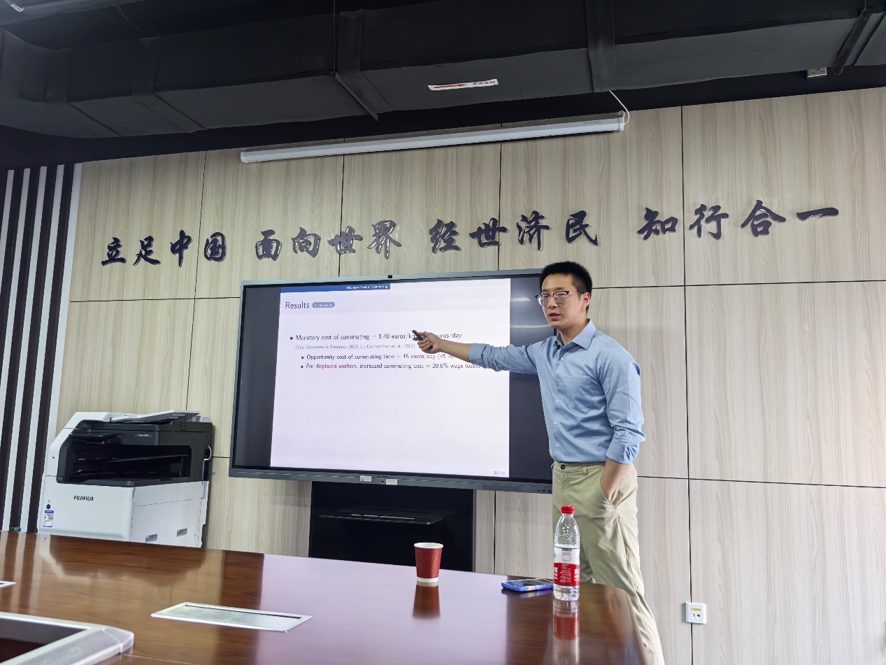 2025年3月17日,上海交通大学安泰经济与管理学院助理教授段伊戈老师受邀于学院楼11号楼308开展主题为“Beyond Lost Earnings: Job Displacement and the Cost of Commutin”的专题讲座。本次讲座由经济学院科研创新专项工作中心主任赵扶扬副教授主持,徐竹烽、胡志安、翟颖佳、陈荣杰、方海东等教师和经济学院学生参加了本次讲座,讲座受到中央财经大学第七批青年科研创新团队支持。