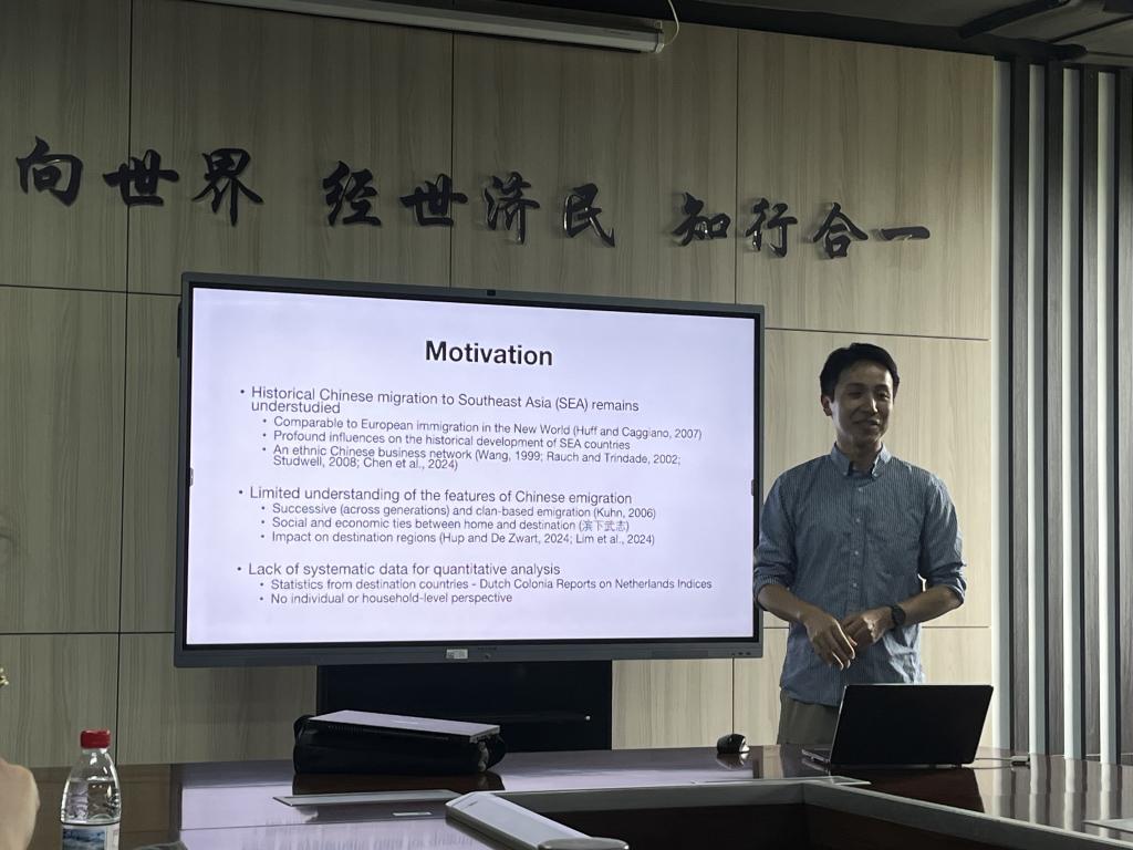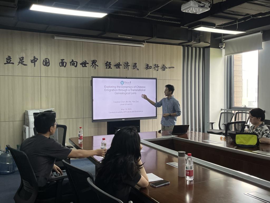 5月16日周五下午,经济学院“中青年学者讲座”于沙河校区学院楼11号楼308会议室举行。此次讲座邀请到暨南大学经济学院陈方豪助理教授,分享题为“Exploring the Dynamics of Chinese Emigration through Transnational Genealogical Lens”的研究。乐鱼在线登录入口胡志安副教授主持讲座,经济学院多位老师和十余名学生参加了此次讲座。