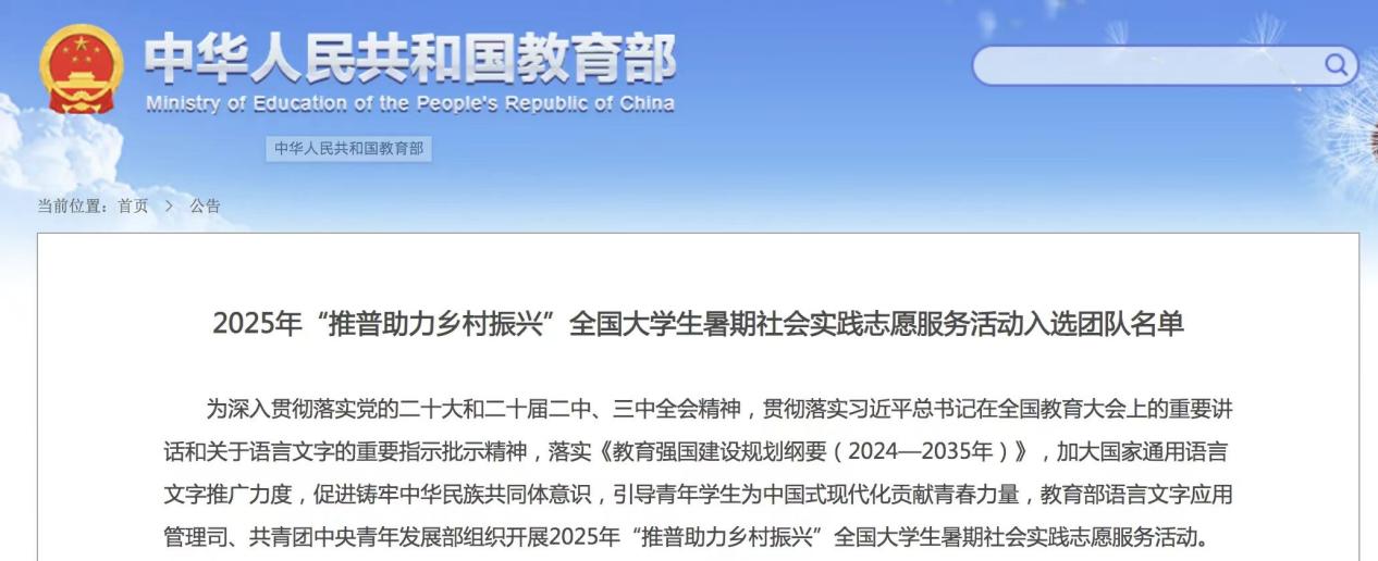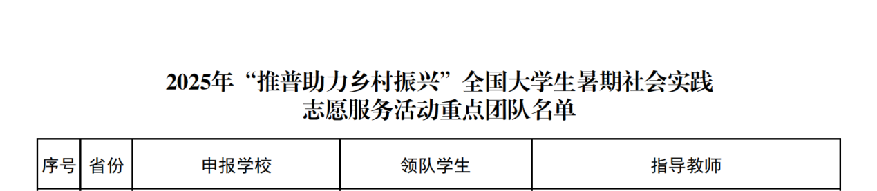 2025年7月4日,教育部公布了2025 年“推普助力乡村振兴”全国大学生暑期社会实践志愿服务活动入选团队名单。乐鱼在线登录入口1支团队入选重点团队,3名教师作为重点团队指导教师。