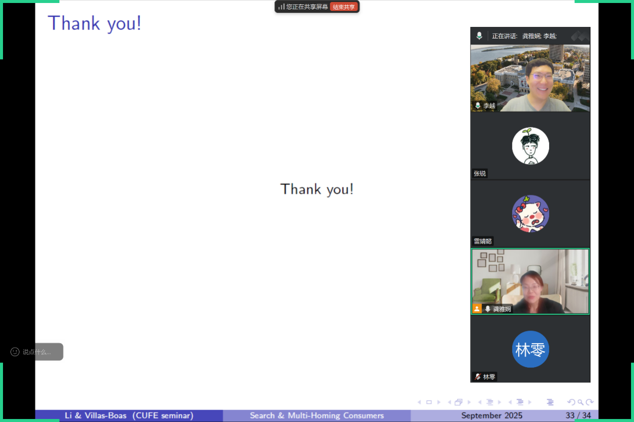 2025年9月24日周三下午,经济学院“中青年学者讲座”在线上举行。此次讲座邀请山东大学经济学院李越老师,分享题为“Sequential Search with Multi-Homing Consumers”的研究。经济学院龚雅娴副教授主持讲座,经济学院多位老师和三十余名学生参加了此次讲座。