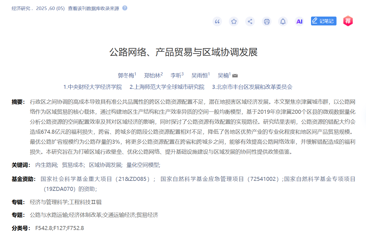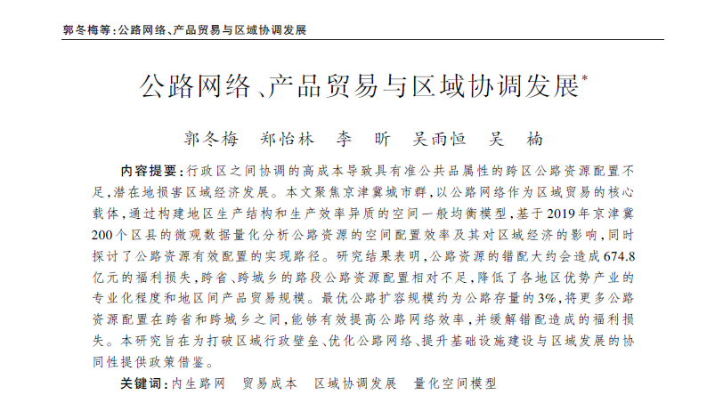 我院郭冬梅老师、吴楠老师和吴雨恒博士生与合作者的论文《公路网络、产品贸易与区域协调发展》在《经济研究》刊发