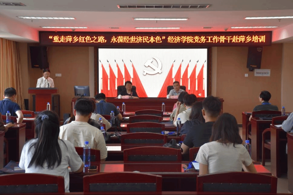 5月24日下午15:00,经济学院党务工作骨干“重走萍乡红色之路,永葆经世济民本色”培训班开班仪式在萍乡市委党校举行。萍乡市委组织部副部长钟萍致辞,他首先对学员们的到来表示热烈欢迎,指出安源是秋收起义的策源地和主要爆发地,是萍乡的“红色”名片。接下来他介绍了萍乡“绿水青山就是金山银山”的“绿色”发展理念。最后,钟萍副部长介绍了萍乡市持续擦亮“群众贴心人”党建品牌,学习推广“四下基层”等党建工作的特色做法,为学员们指出了好党员的价值追求、行动方向。